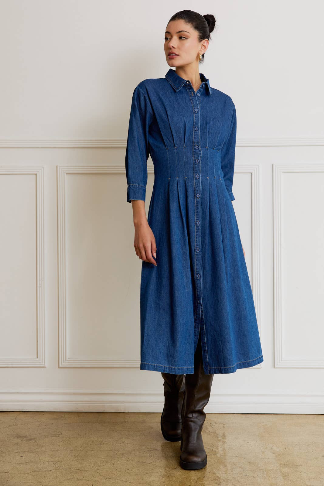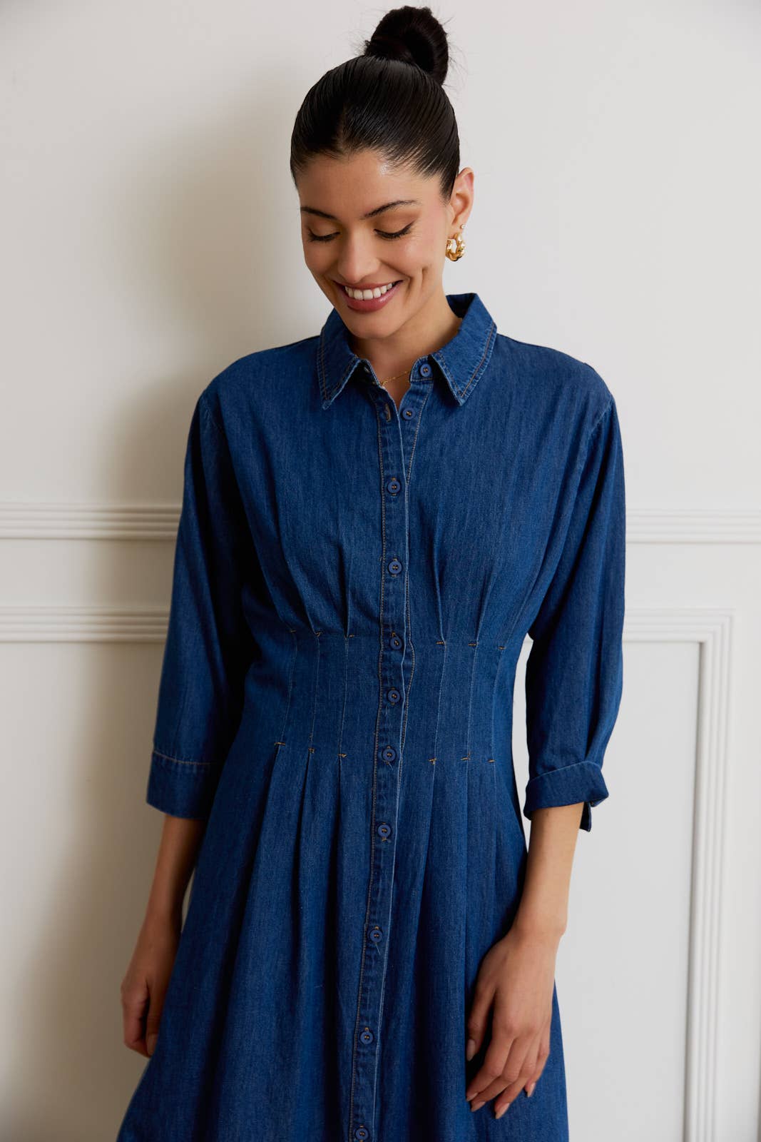 Step out in style with the Collins Denim Midi Dress! Featuring a button-down front and charming pleat details, this long-sleeve dress blends classic denim with a fun, feminine twist. Perfect for playful days and casual evenings, it brings effortless cool and comfort wherever you go.