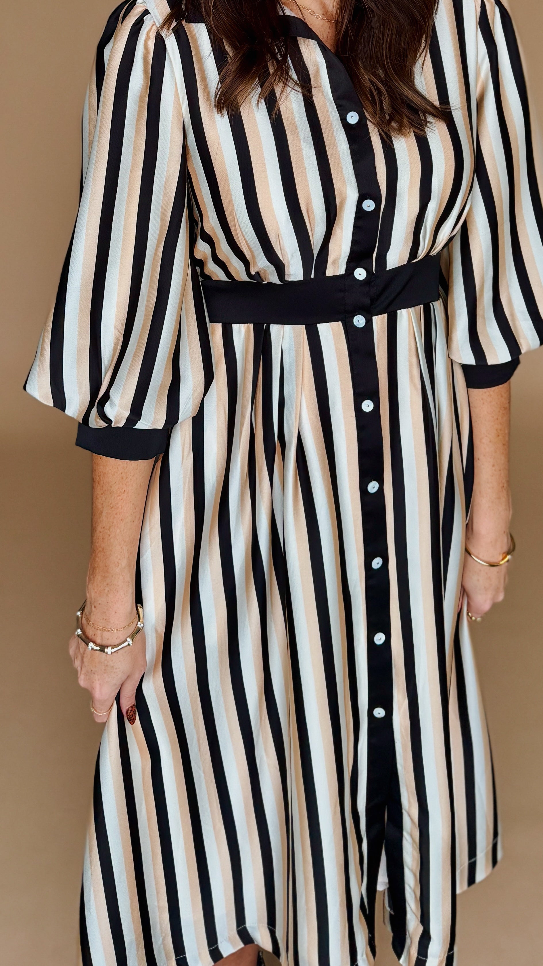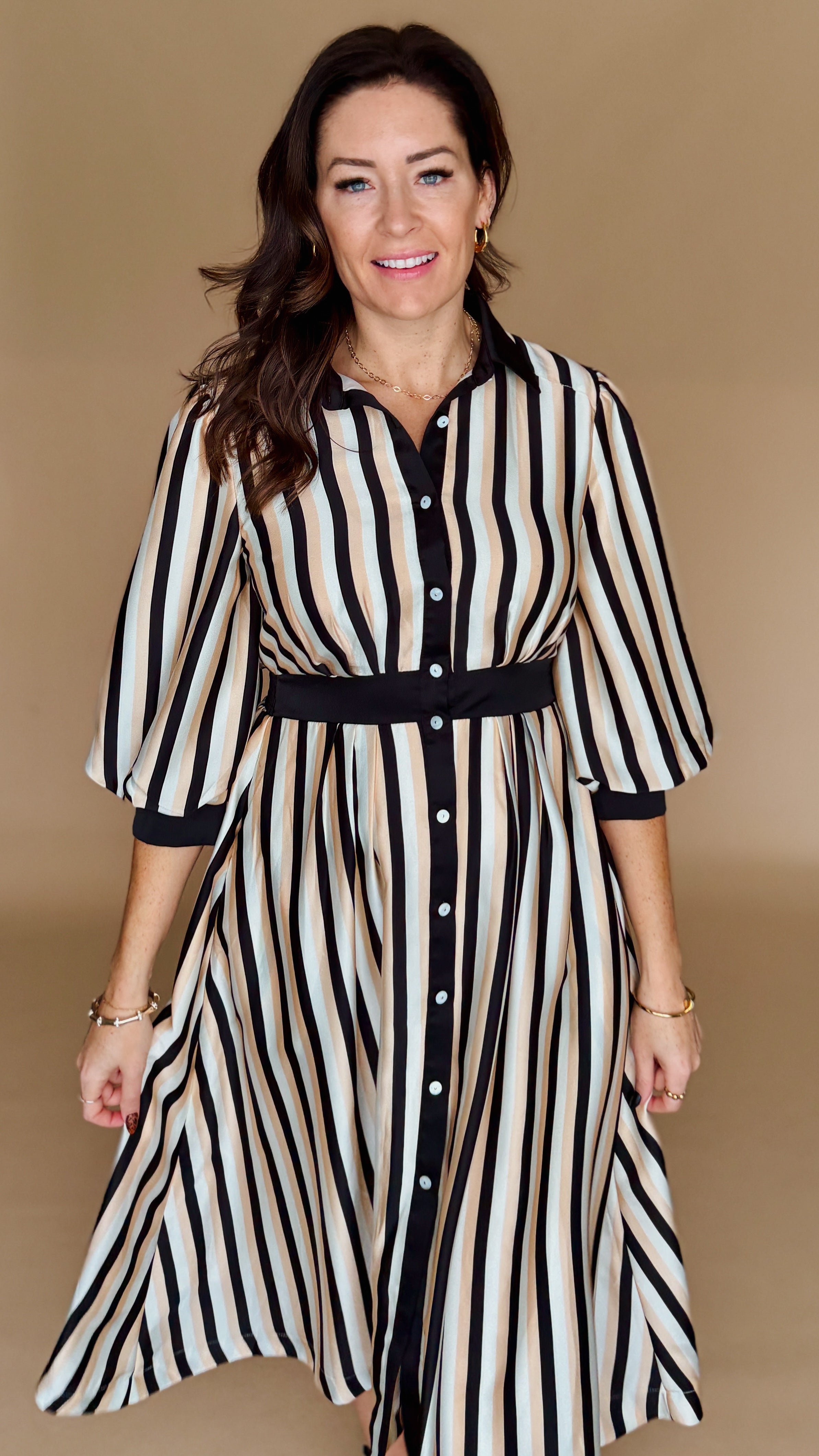 The Maren Midi Dress brings playful sophistication to your everyday look. Made from smooth satin with chic neutral stripes, this button-down shirt dress features a classic collar and a sleek silhouette that flatters any figure. An elastic panel at the back waist adds comfortable stretch, making it perfect for brunch dates or casual office days without sacrificing style.