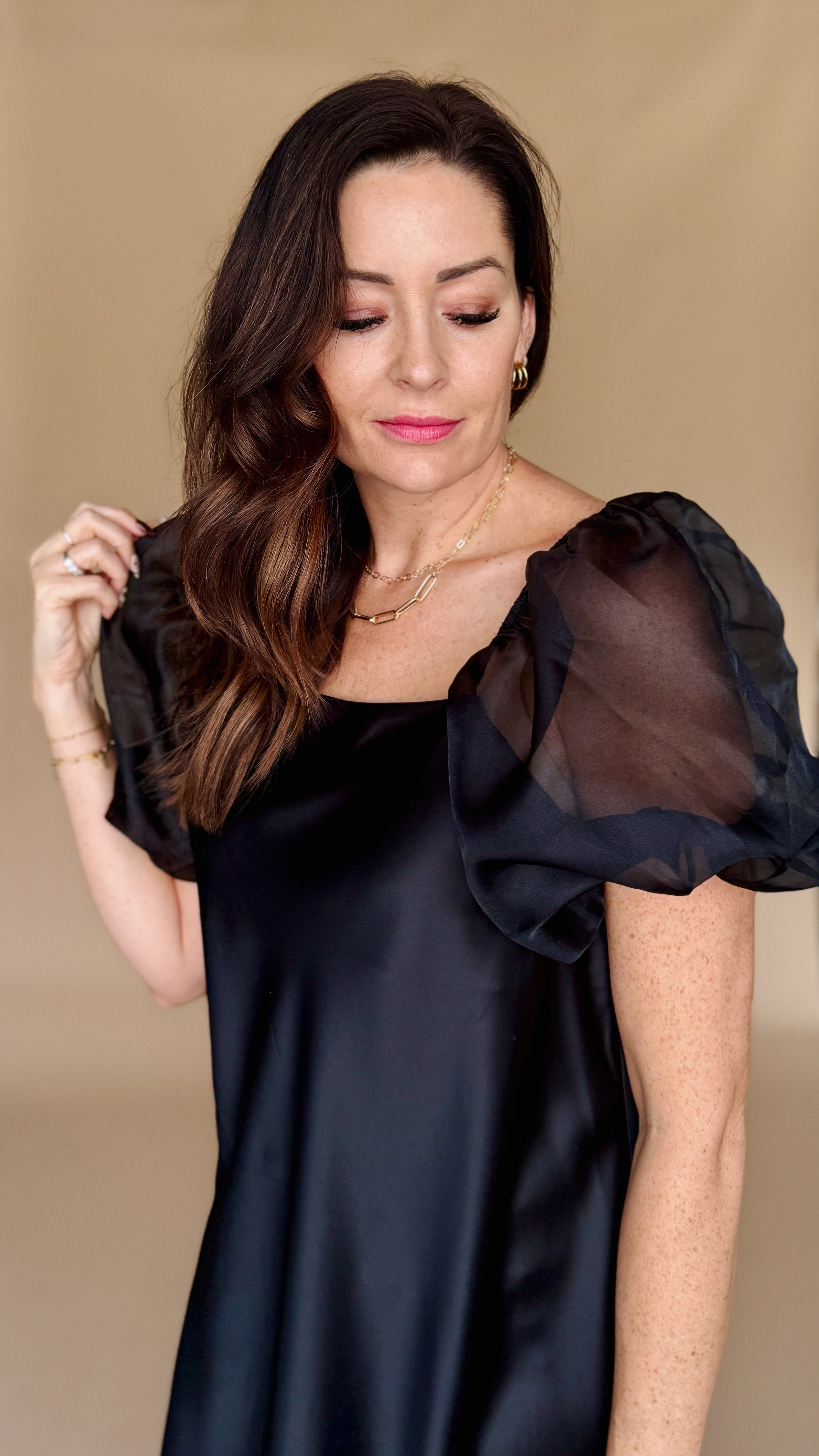 Make a statement in our Night Out Mini Dress. With its puff sleeves and sleek satin material, this dress is perfect for a night out on the town. Stand out from the crowd with this playful and stylish piece. (Slay the night with our mini dress!)