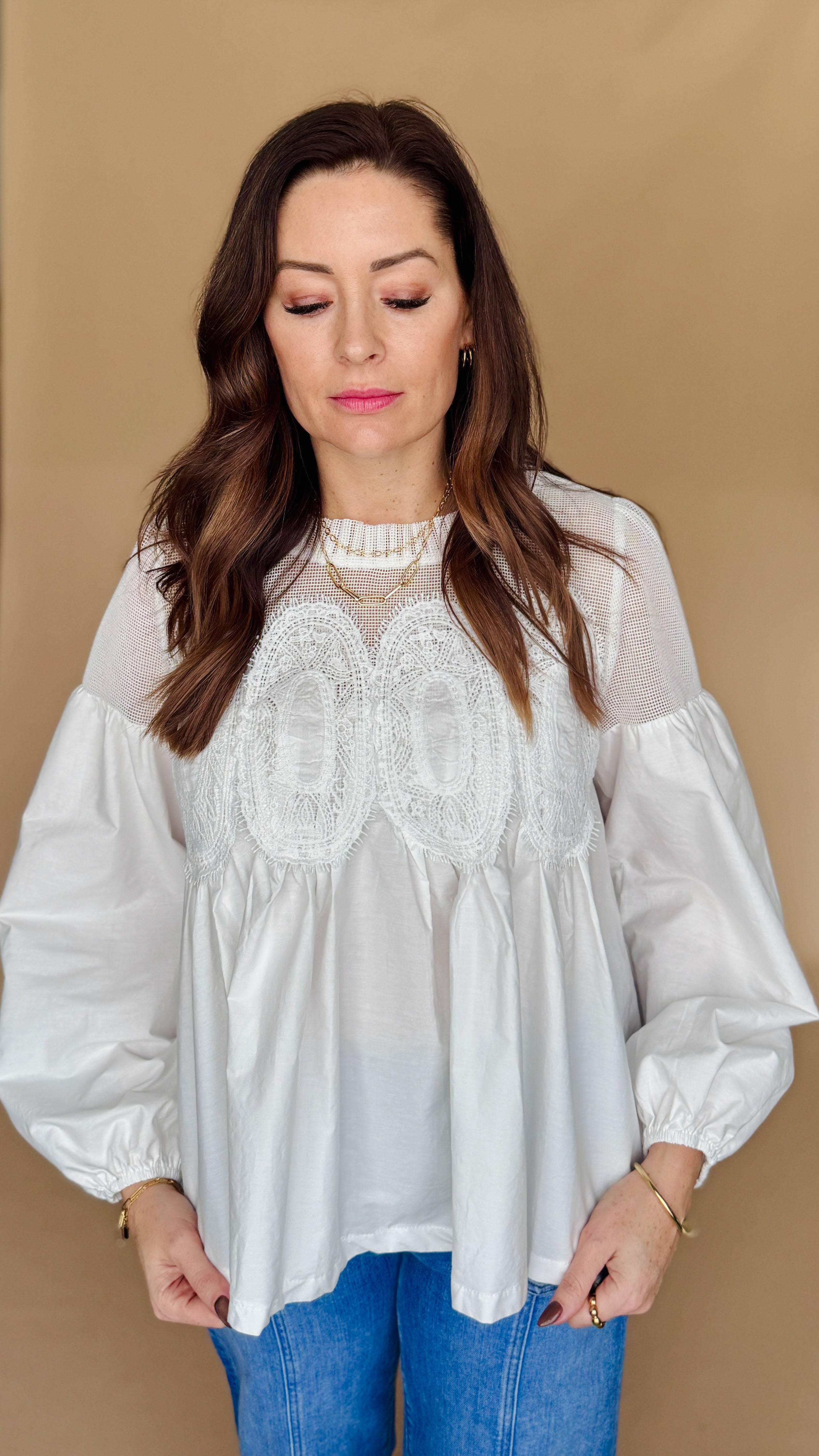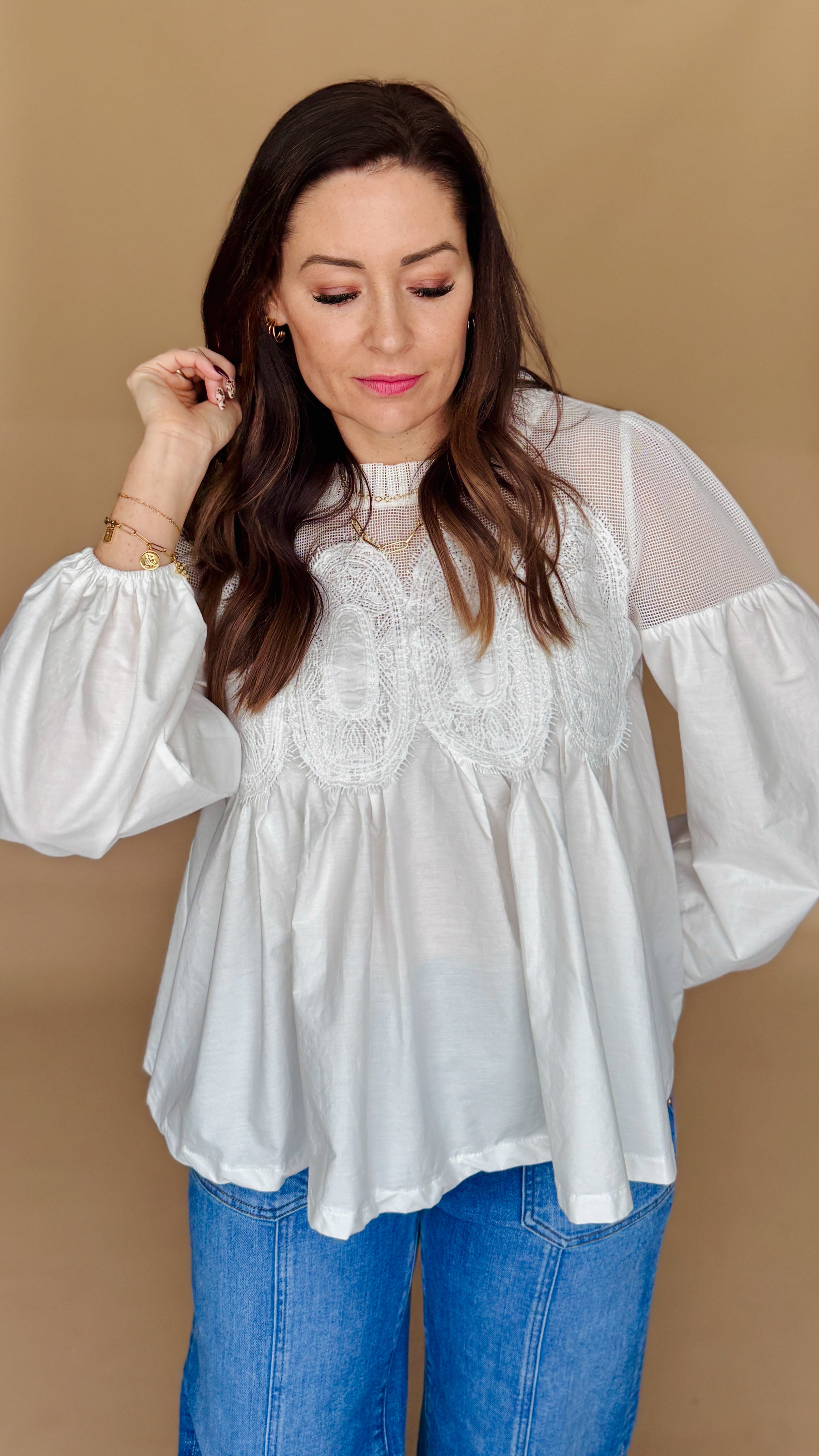 Add a touch of elegance to your wardrobe with the Graceful Moments Blouse. Featuring delicate lace appliqué detail, a stylish neckline, and elastic wrists, this blouse is perfect for any occasion. Bring grace and style to your outfit today!