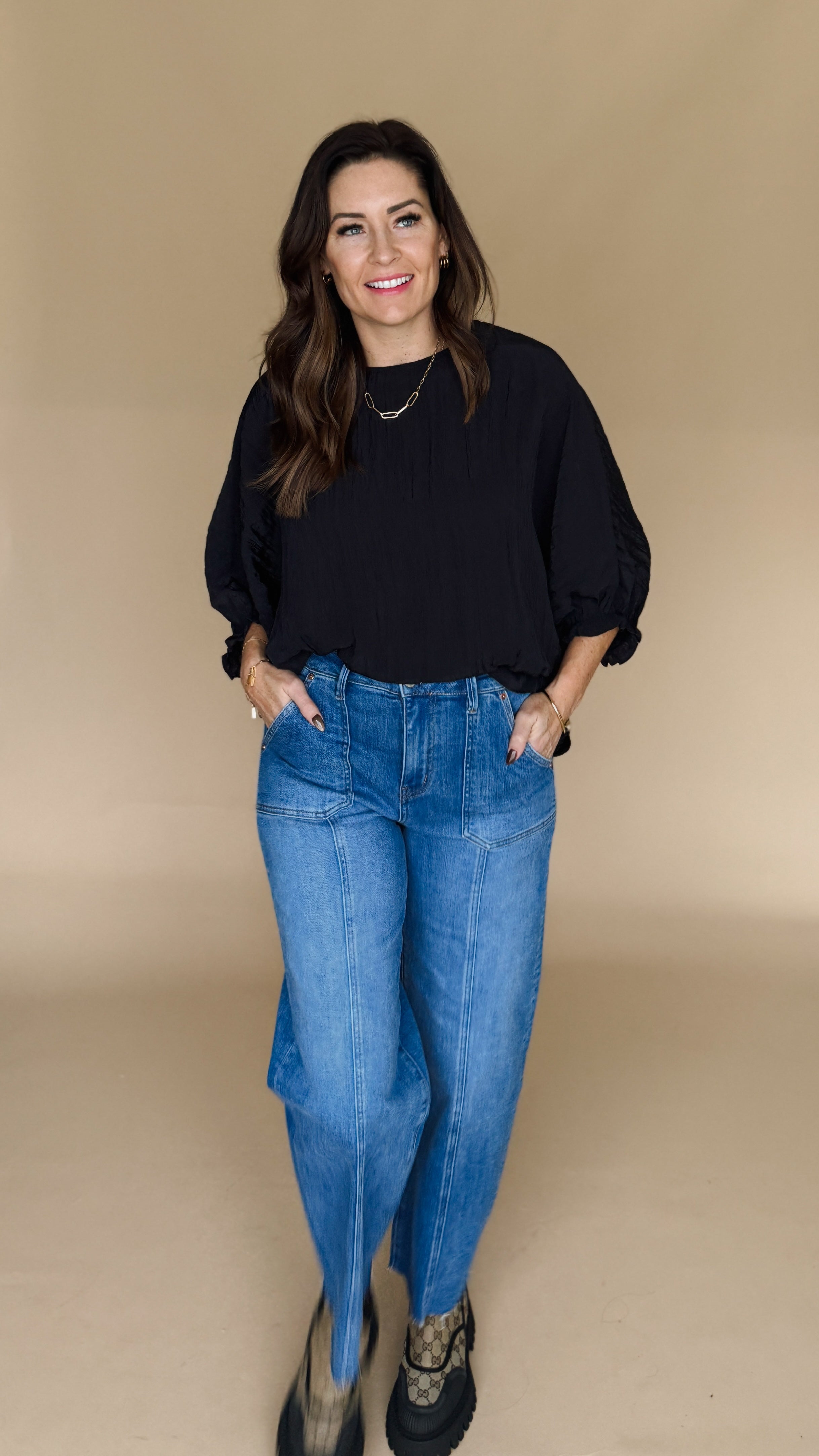 Elevate your style game with our Flowy For the Win Blouse! Featuring loose sleeves and a flowy design, this blouse is the perfect way to add a touch of elegance to any outfit. Its flattering fit is sure to make you feel confident and stylish.