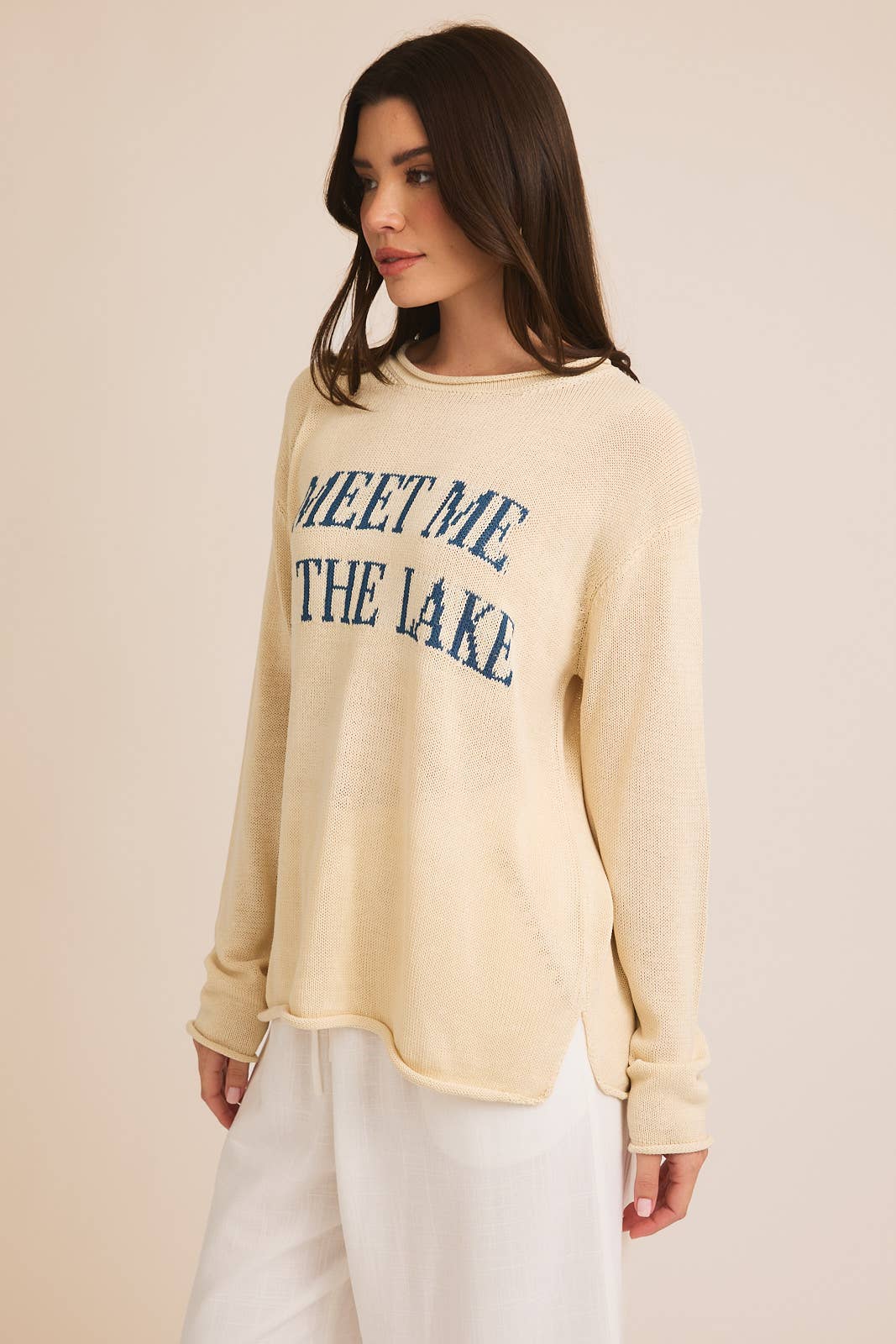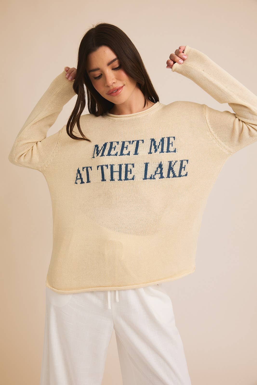 Cozy up to lakeside vibes with this charming knit sweater featuring the sweet message "Meet Me At The Lake." Crafted from soft, breathable knit fabric, it's the perfect layering piece for cooler days or a breezy cover-up when temperatures rise. Whether you're heading to the shore or just dreaming of summer adventures, this versatile sweater brings a touch of whimsy to your wardrobe. Slip it on over your favorite tee, pair it with shorts, or wear it solo—this go-anywhere essential keeps you comfortable and stylish season after season.