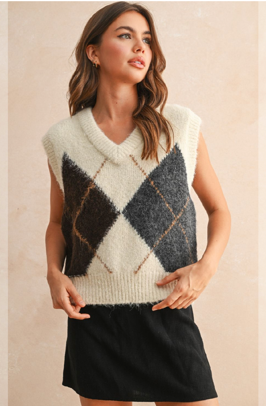 Stay cozy and stylish with the Ainsley Argyle Sweater Vest, crafted from ultra-soft fabric that feels like a warm hug. Its neutral tones make it effortlessly versatile—perfect worn solo for a casual cool vibe or layered over your favorite tops for an extra dash of charm. Embrace this playful essential that’s as comfortable as it is cute!