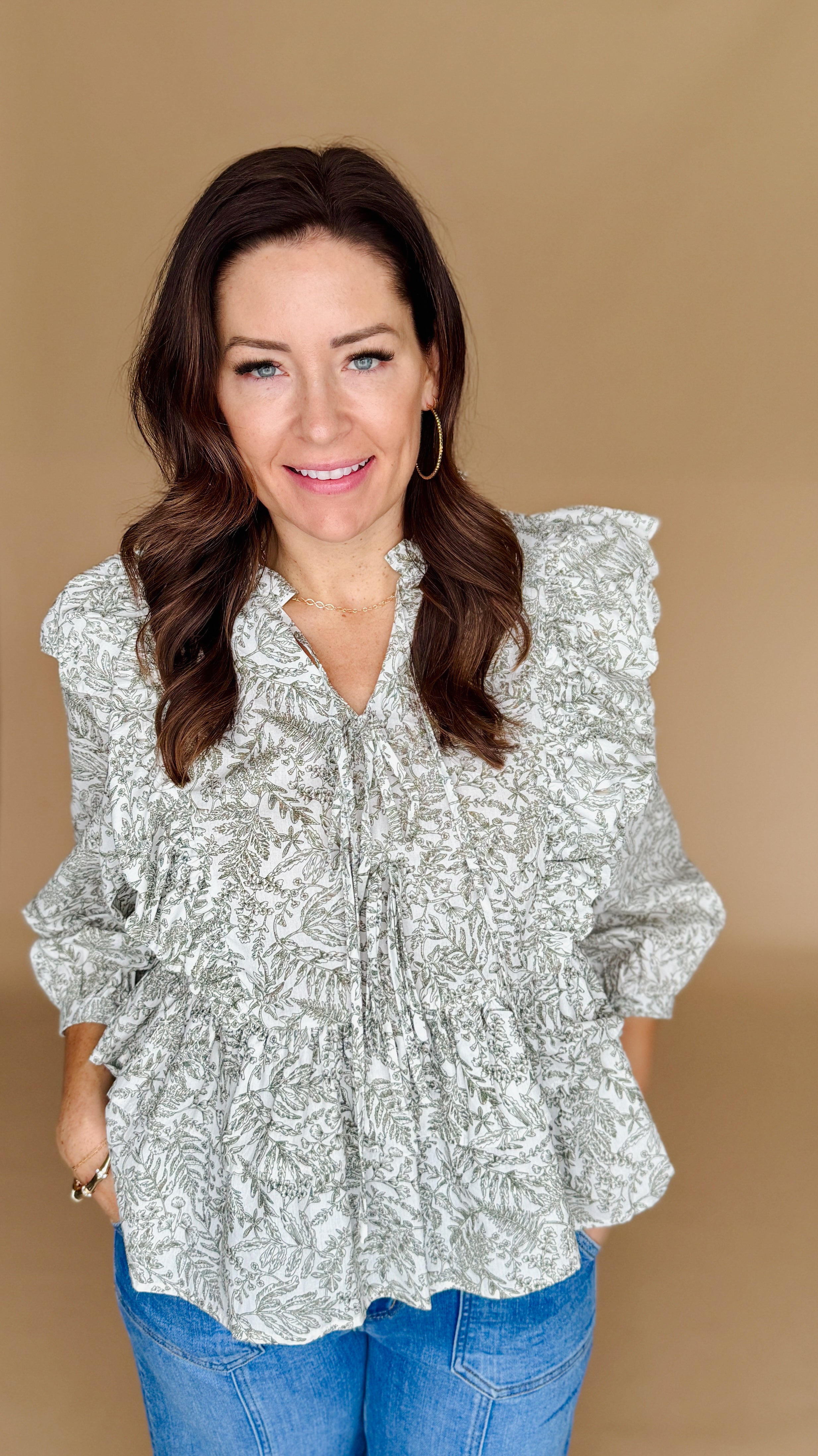 Embrace playful charm with the Autumn Canvas Top, featuring a delicate olive leaf pattern on crisp white fabric. The ruffled collar adds a flirty touch, while the ties offer adjustable comfort. Finished with a peplum bottom, this top brings effortless movement and a hint of whimsy to your wardrobe. Perfect for brightening up any day with fresh, nature-inspired style.