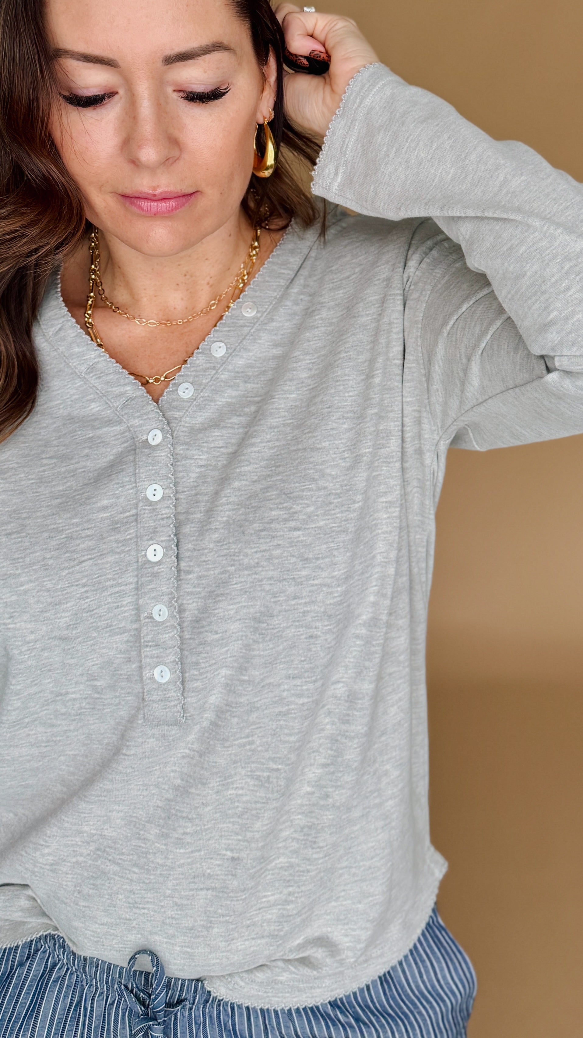Add a touch of charm to your closet with The Margot Scallop Top. This long-sleeve favorite stands out with whimsical scalloped edges and cute button details, bringing playful elegance to your everyday look. Crafted from super soft fabric, it promises cozy comfort alongside its fun style. Elevate your outfits with a delightful twist that’s as comfortable as it is unique.